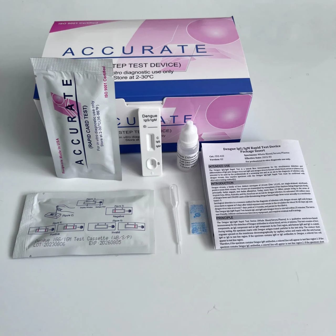 English This is the Accurate Dengue IgG/IgM Rapid Test Device, a lateral flow immunoassay for the simultaneous detection and differentiation of IgG and IgM antibodies to the Dengue virus in human blood. It is used as a screening test and an aid in the diagnosis of infection with Dengue viruses, providing results within 25 minutes. The kit includes the test cassette, a dropper, a buffer diluent, and an instruction insert. It is an essential tool for clinicians to quickly identify Dengue fever, which is transmitted by mosquitoes in tropical and subtropical regions.