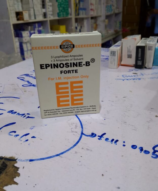 Sawirka wuxuu muujinayaa Epinosine-B Forte, oo ah dawo isku dhaf ah oo loo isticmaalo mudid (duritaan). Dawadan waxaa badanaa loo qoraa si loo daaweeyo xanuunada neerfaha, daalka jirka, iyo kordhinta tamarta unugyada. Waxay ka kooban tahay walxo caawiya hagaajinta hab-dhiska neerfaha iyo unugyada jirka. Waxay u timaadaa qaab budo ah (lyophilized) iyo biyo gaar ah oo lagu dhex qaso ka hor intaan qofka lagu mudin muruqa.