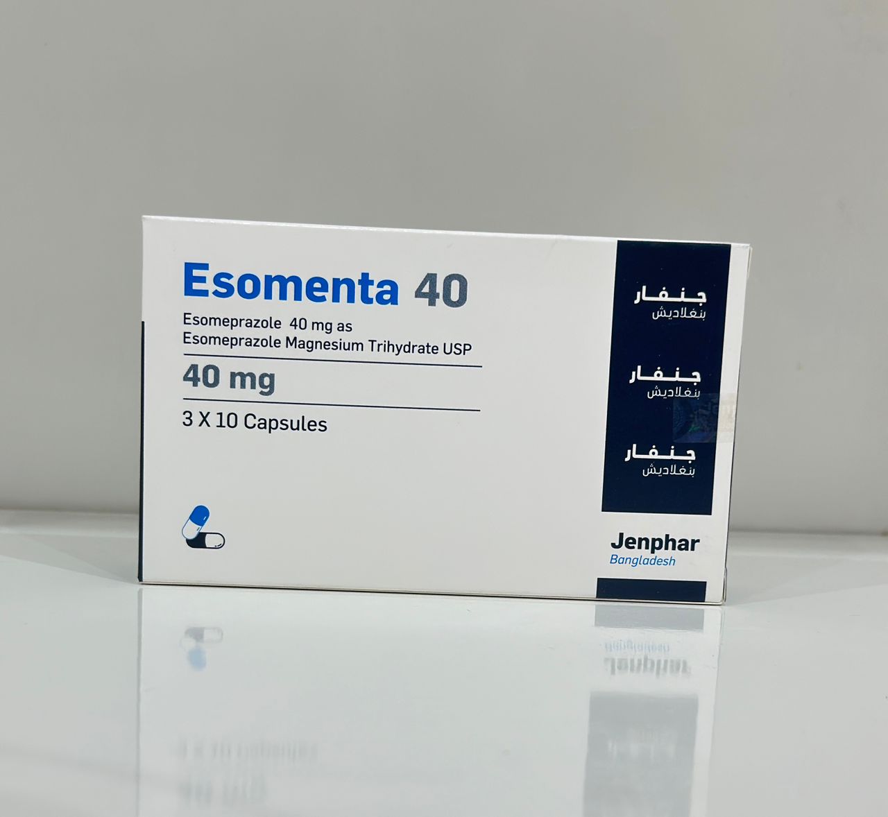 Sawirkani wuxuu muujinayaa sanduuqa dawada Esomenta 40, oo ay soo saarto shirkadda Jenphar. Maaddada firfircoon ee ku jirta waa Esomeprazole (40 mg). Waa dawo ka tirsan kooxda Proton Pump Inhibitors (PPIs) oo aad u xoog badan, loona isticmaalo in lagu yareeyo aashitada caloosha. Waxay wax weyn ka tartaa laab-jeexa daran, boogaha caloosha (ulcers), bararka hunguriga (Esophagitis), iyo xanuunada kale ee dheef-shiidka ee aashitadu keento. Waxay kaga duwantahay Omeprazole-ka caadiga ah in ay si dhakhso leh oo xooggan u xakamayso aashitada.