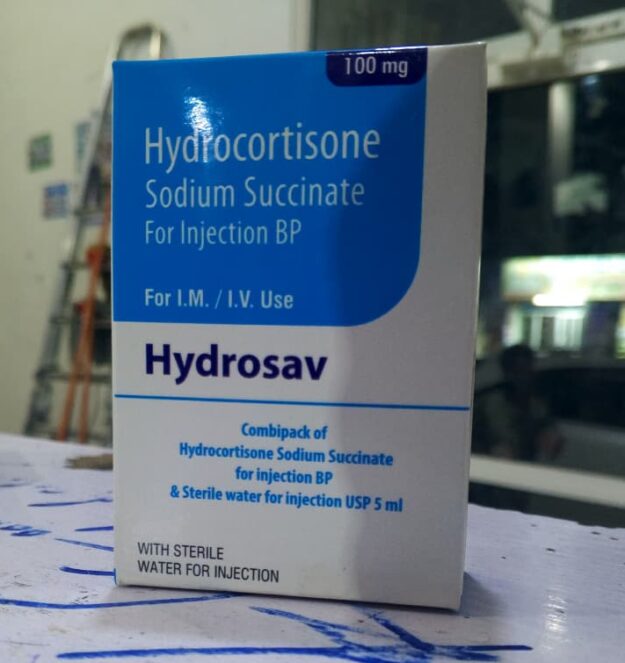 Sawirkani wuxuu muujinayaa Hydrocortisone Sodium Succinate (Hydrosav), oo ah dawo ka tirsan kooxda loo yaqaanno Corticosteroids. Waa dawo xooggan oo loo isticmaalo in lagu yareeyo caabuqa iyo xasaasiyadda daran. Waxaa badanaa loo qoraa xaaladaha degdegga ah sida neef xiranka (asthma), xasaasiyadda aadka u daran (anaphylaxis), ama marka qanjidhada kelyaha dushooda ku yaal aysan soo saarayn hormoonno ku filan. Waxaa lagu bixiyaa oo kaliya mudid (I.M. ama I.V.) iyada oo uu kormeerayo qof xirfadle caafimaad ah.