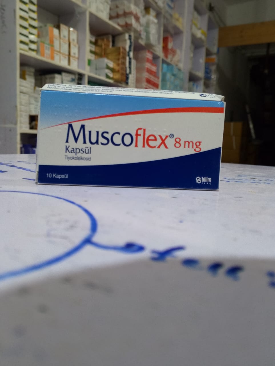 Sawirka wuxuu muujinayaa Muscoflex, oo ah kaabsoollo ka kooban maaddada Thiocolchicoside. Dawadan waxaa loo yaqaanaa “muscle relaxant” ama dawooyinka nasiya muruqyada. Waxaa loo isticmaalaa in lagu daaweeyo majiirka ama kacsanaanta xanuunka leh ee muruqyada, gaar ahaan xanuunada dhabarka, qoorta, iyo dhaawacyada muruqyada ee ka dhasha kacsanaanta neerfaha.