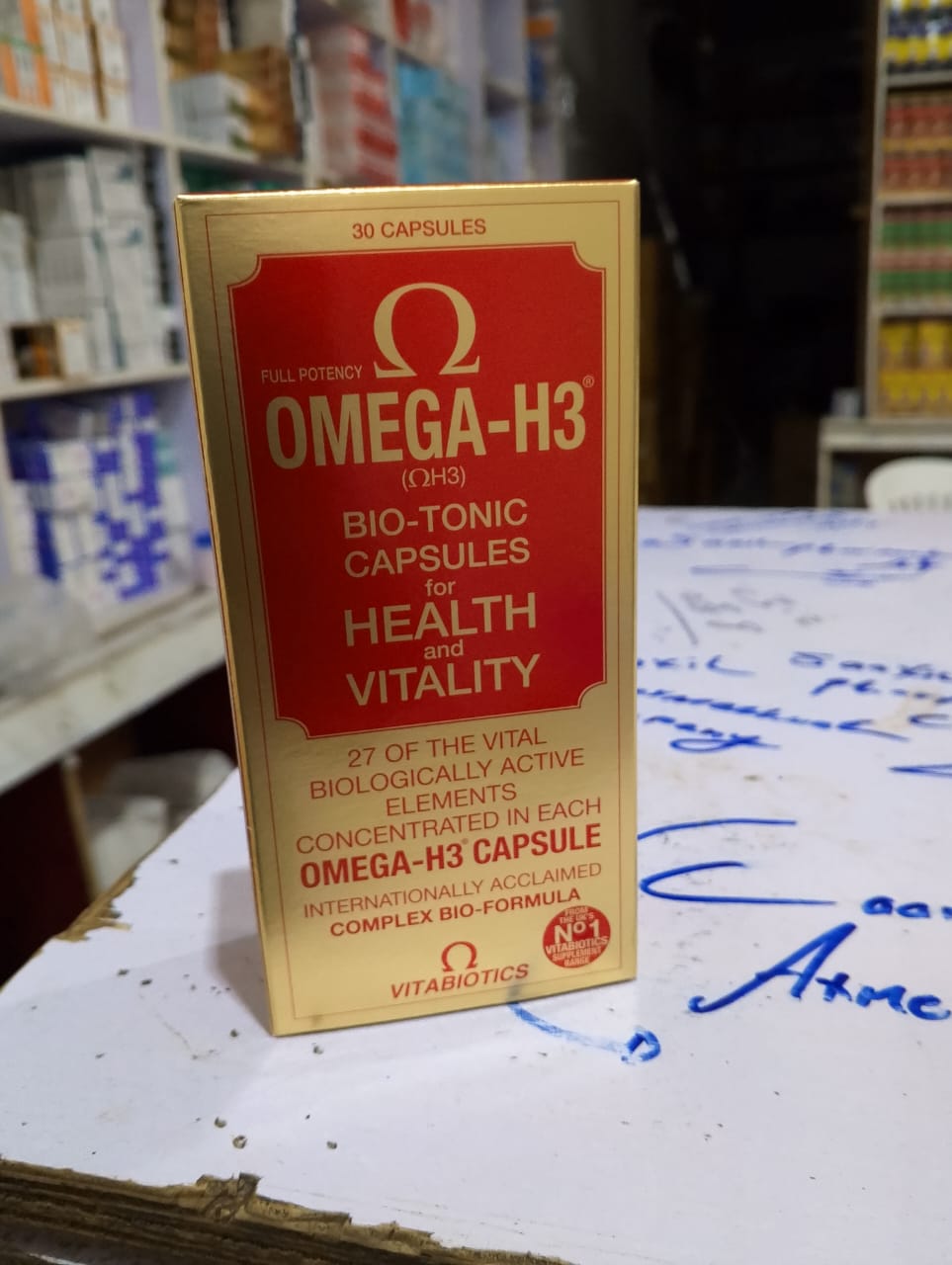 Sawirka wuxuu muujinayaa Omega-H3, oo ah kaabsoollo loogu talagalay caafimaadka guud iyo firfircoonida jirka. Ma ahan dawo lagu daaweeyo xanuun gaar ah, laakiin waa nafaqo isku dhaf ah (multi-vitamin and mineral) oo ka kooban 27 walxood oo muhiim u ah jirka. Waxay caawisaa kordhinta tamarta, xoojinta habka difaaca jirka, iyo hagaajinta caafimaadka guud ee maskaxda iyo jirka.