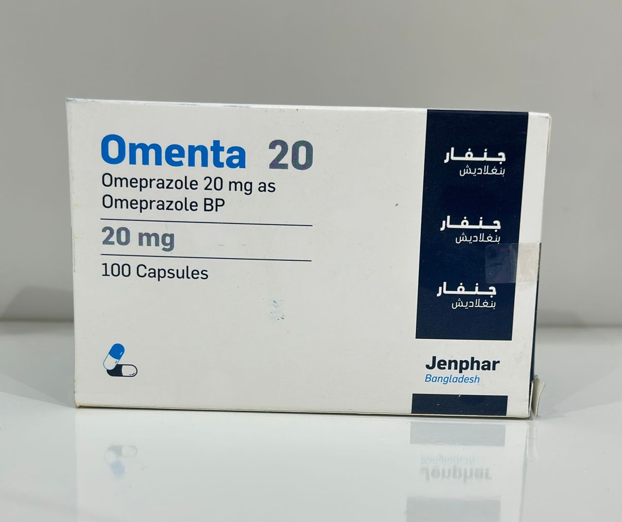 Sawirkani wuxuu muujinayaa sanduuqa dawada Omenta 20, oo ay soo saarto shirkadda Jenphar. Maaddada firfircoon ee ku jirta waa Omeprazole (20 mg), oo ka tirsan kooxda loo yaqaanno Proton Pump Inhibitors (PPIs). Dawadan waxaa loo isticmaalaa in lagu yareeyo aashitada badan ee caloosha soo dayso. Waxay aad u caawisaa dadka ka sheegaya laab-jeexa, boogaha caloosha (Gastritis/Ulcers), iyo dhibaatooyinka kale ee dheef-shiidka ee la xiriira aashitada.