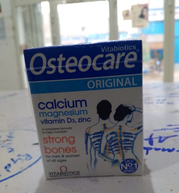 Sawirka wuxuu muujinayaa Osteocare, oo ah kabaal nafaqo oo loogu talagalay xoojinta lafaha iyo ilkaha. Waxay ka kooban tahay isku dhiska macdanta Calcium, Magnesium, Zinc, iyo Vitamin D3. Waxaa loo isticmaalaa in lagu ilaaliyo caafimaadka lafaha dadka waaweyn iyo carruurta, waxayna aad muhiim u tahay xilliga uurka, nuujinta, iyo dadka waayeelka ah si looga hortago jilicsanaanta lafaha (osteoporosis).