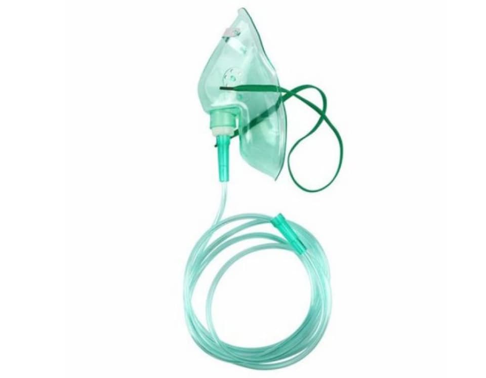 English This is a standard medical oxygen facemask equipped with supply tubing. It is used to deliver oxygen therapy to patients who require respiratory support due to low blood oxygen levels. The mask is constructed from soft, transparent PVC for patient comfort and visual monitoring, featuring an adjustable nose clip and an elastic head strap to ensure a secure fit and minimize oxygen leakage. It is a single-use, disposable device designed to maintain hygiene and prevent cross-contamination in clinical settings.