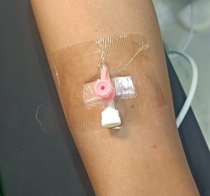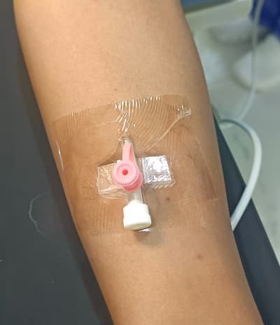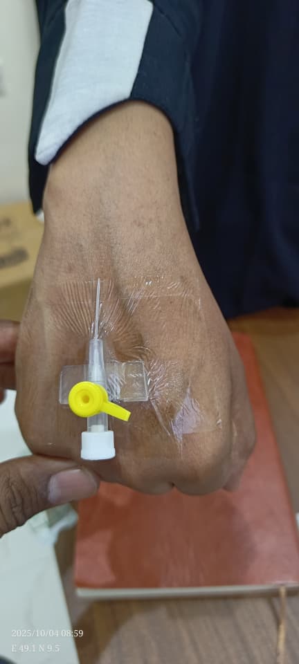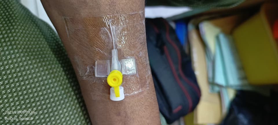 Muuqaalkani wuxuu muujinayaa sharootada hufan ee PU (Polyurethane) oo lagu dhejiyay gacanta si ay u xajiso kanulada pink-ga ah (20G). Sharootadan waxay u oggolaanaysaa maqaarka inuu neefsado iyadoo ka ilaalinaysa meesha irbadda bakteeriyada, biyaha, iyo wasakhda. Maadaama ay hufantahay, kalkaaliyuhu wuxuu si joogto ah u eegi karaa haddii uu jiro barar ama dhiig.