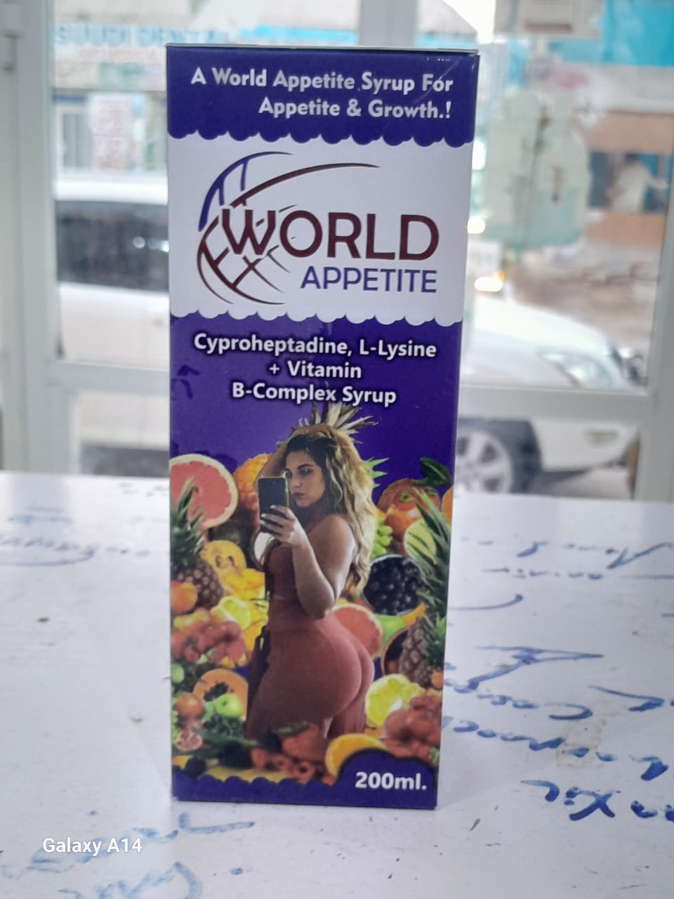 Sawirka wuxuu muujinayaa World Appetite, oo ah sharoobo isku dhaf ah oo loogu talagalay kordhinta rabitaanka cuntada iyo koritaanka jirka. Waxay ka kooban tahay maaddada Cyproheptadine (oo kicisa gaajada), L-Lysine (oo ah amino acid muhiim u ah koritaanka), iyo fiitamiinnada kooxda B-Complex. Dawadan waxaa badanaa loo isticmaalaa dadka raba inay miisaan kordhiyaan ama carruurta dhibaatadu ka haysato xagga cuntada si ay u helaan nafaqo iyo tamar ku filan.